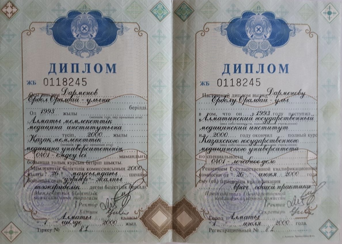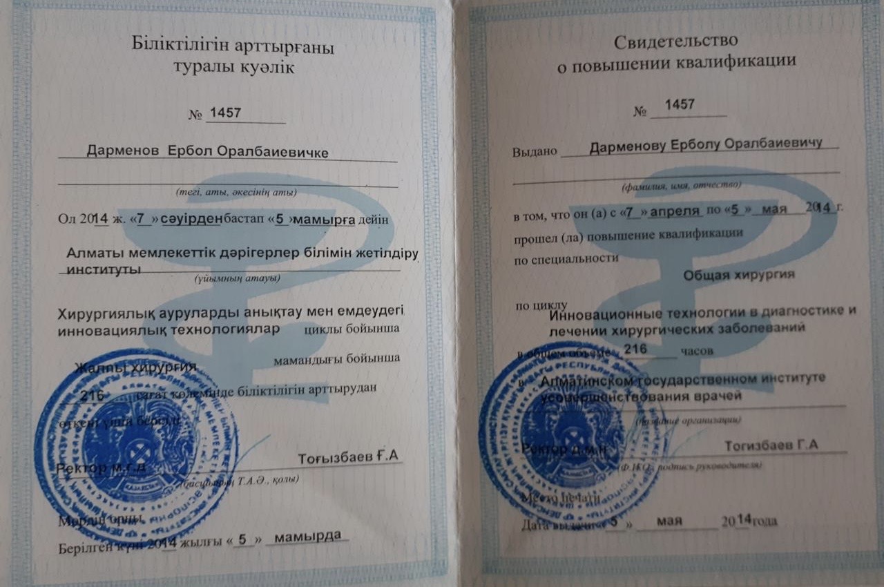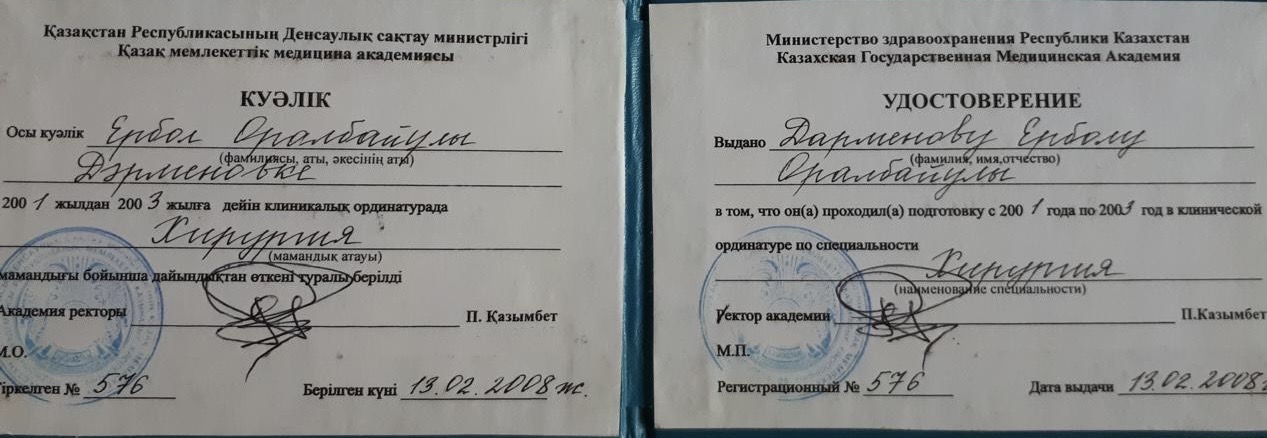 Доктор Ербол Дарменов – опытный хирург с более чем 25-летним стажем в общей хирургии и более чем 12-летним опытом в эстетической хирургии. Он специализируется на маммопластике, липосакции тела и абдоминопластике. Кроме того, он занимает должность секретаря общества пластических реконструктивных и эстетических хирургов Республики Казахстан. Доктор Ербол получил свое образование в институте имени Асфендиярова в 2000 году и прошел клиническую ординатуру по хирургии в 2002 году. В 2013 году он переквалифицировался в пластического хирурга. Он также прошел обучение и повышение квалификации по пластической хирургии в городах Бишкек, Ташкент и Анкара, включая недавнее обучение в Турции.